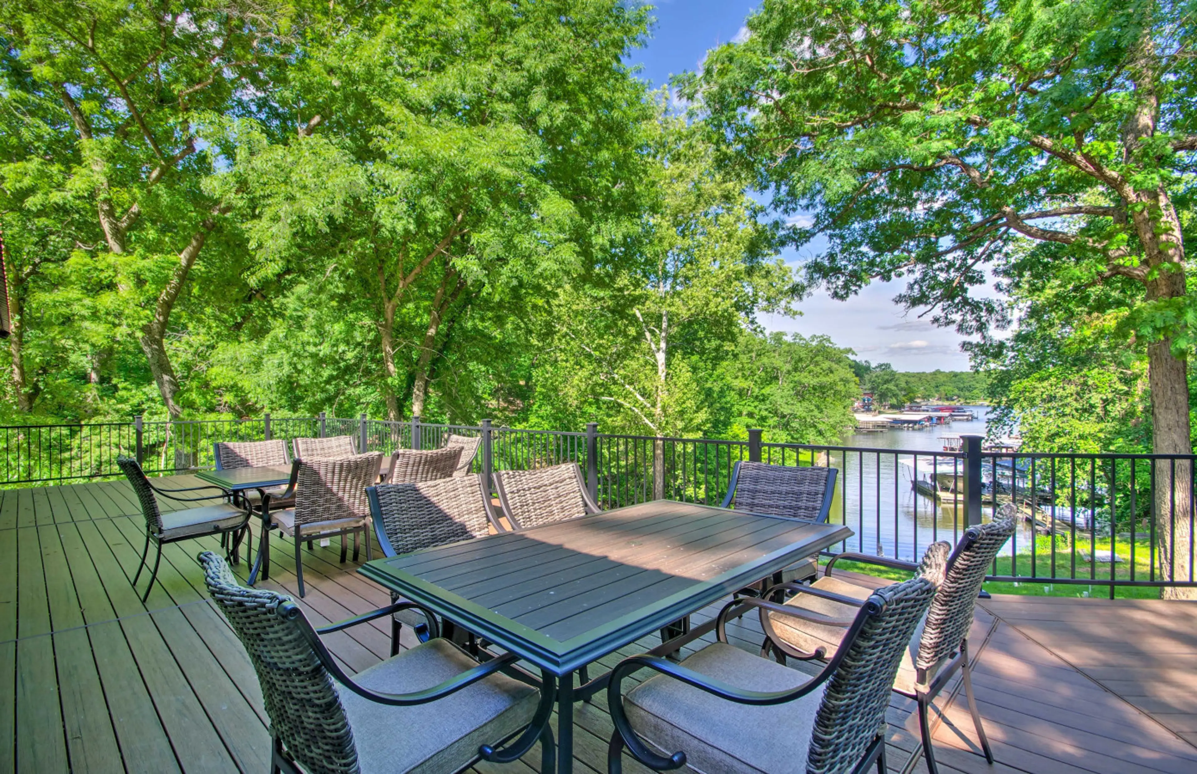 Wake up to breathtaking water views at this spacious Lake of the Ozarks retreat! With a main home plus guest studio, thereโs room for everyone to relax and reconnect. This home offers: ๐ Lakefront access with private dock & boat slip ๐ Sleeps 20 across 2 homes + bonus spaces ๐ฅ Outdoor dining, gr...